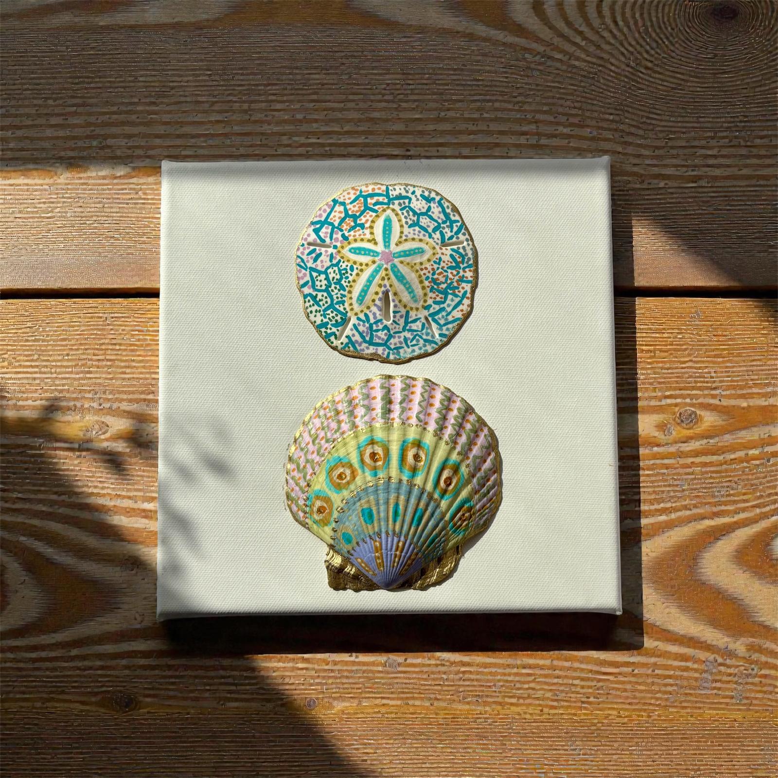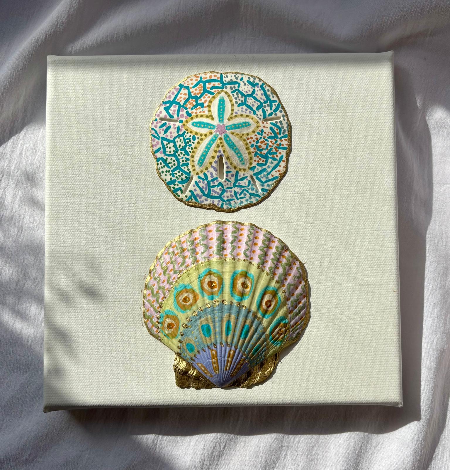 יצירה מקורית המשלבת צדפה טבעית וצדפת Sand Dollar, צבועות ביד בצבעי אקריליק ומונחות על קנבס איכותי.